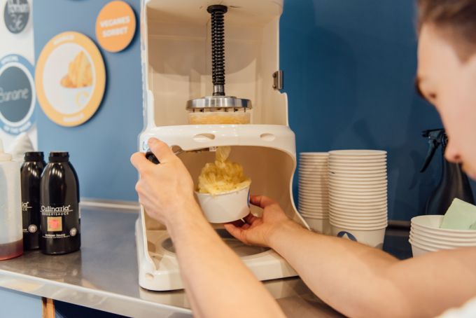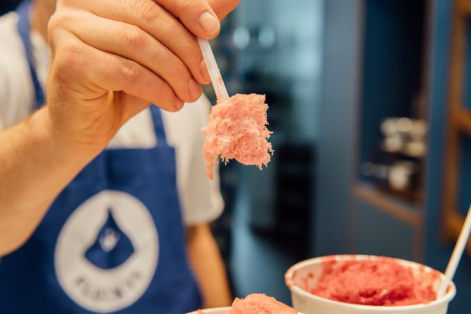 Das Eis gibt es als Milcheis oder als veganes Sorbet im Becher. Die Zutaten werden alle vermischt und bei -25 Grad zu einem riesigen Eisblock gefroren. Der Eisblock wird dann in eine Maschine eingespannt – ein Mitbringsel aus Thailand – und dann wird und das Eis gehobelt. Das Resultat ist locker fluffiges Eis, das nur so auf der Zunge zergeht und kein Völlegefühl auslöst. Andreas und sein Partner Jens tüffeln ununterbrochen an neuen Sorten, mittlerweile gibt es zwischen 25 und 30 Geschmackssorten, davon sind aber nicht alle zur selben Zeit erhältlich. Heute gab's die Sorten Himbeer-Grapefruit, Erdnuss, Mango, Schoko, Erdbeere, Banane und meinen heimlichen Favoriten Quark-Rosmarin. Ist der Becher erstmal mit dem Schnee gefüllt, kann man sich noch ein passendes Topping aussuchen. Hier gibt es von Streuseln und Cornflakes über Früchte bis hin zu Käsekuchenstücke alles, was das Eisfoodieherz beglückt.