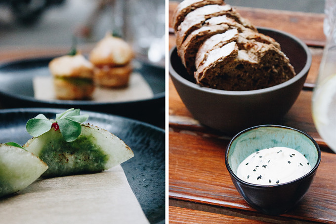 Wie auch bei meinem ersten Dinner im Bricole vor drei Jahren, sitzen wir wieder auf der Terrasse. Es ist Ende August 2020 und noch immer schön schön warm. Selbst als es etwas später leicht anfängt zu regnen, zieht sich kaum einer der anderen Gäste in den Gastraum zurück, auch wenn hier auf den nötigen Abstand zwischen den Tischen und auf die Hygienemaßnahmen geachtet wird. Zur Begrüßung bekommen wir von Fabian einen Aperitif. Für meine Begleitung gibt's den Yuzu Bellini, für mich einen alkoholfreien Citrus-Seedlip Tonic. Der Brotkorb folgt schnell, dazu wird aufgeschlagene Karamellbutter gereicht und ich will nie wieder andere Butter essen. Wir stürzen uns über das noch warme Brot und begehen wieder einmal fast den Fehler, uns am Brot satt zu essen.