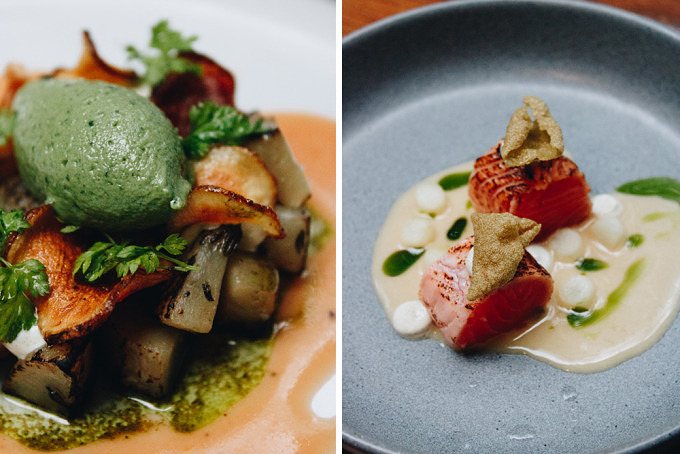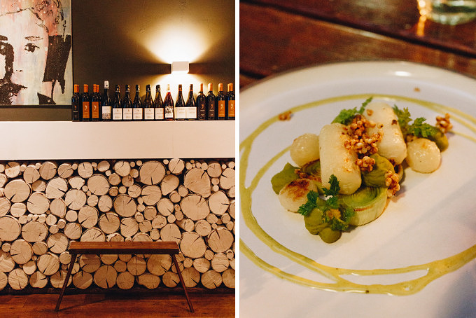 Während hier früher Hors d’oeuvre auf der Karte standen, gibt es heute zwei Menüs zur Auswahl, von dem eines immer vegetarisch ist. Wenn ihr euch für eines entschieden habt, könnt ihr noch zwischen vier, fünf oder sechs Gängen wählen. Dazu gibt es optional auch eine Weinbegleitung. Wir sind zu zweit und nehmen beide Menü-Varianten.