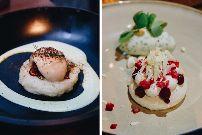 Die einzelnen Gerichte sehen nicht nur toll aus, sie schmecken auch hervorragend. Hier mal ein kleiner Auszug aus unseren Menüs: Geflämmte Topinambur mit Gazpachosud und Sauerampfereis und geflämmter Lachs it grünem Apfel, Joghurt Dashi und Wakamechip, Pfifferlinge auf Kartoffelstampf und Schnittlauch, Lammtatar mit Rettich, Aal und Kräuterreis, Sellerie mit Pilz, Rote Beete und Gemüsejus und als Dessert Pavlova mit Himbeeren, Macadamia und Zitrone – das Dessert ist bei beiden Menüs das gleiche. Seit unserem Besuch vor ein paar Wochen gibt es wieder ein neues Menü, da im Bricole neben der Qualität auch immer auf die Saisonalität der Produkte geachtet wird.