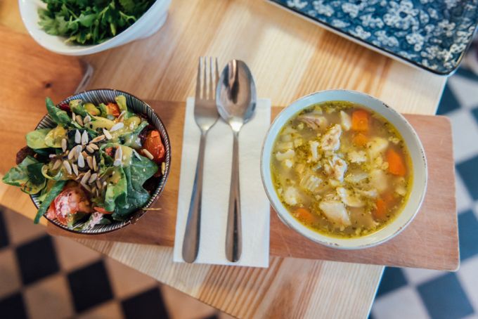Die Salate und Suppen werden in verzierten Keramikschüsseln auf kleinen Holzbrettern serviert. Man merkt, sieht und schmeckt, dass Anne und ihr Team nicht nur auf die Qualität, sondern auch auf die Präsentation des Essens achten. Der Coffee Room ist ein bisschen wie ein Wohnzimmer, gemütlich und familiär. Neben dem hausgemachten Essen und dem netten Service schätzen das die Gäste besonders und verbringen gern die Mittagspause oder den Samstagnachmittag in dem Café – so wie wir.