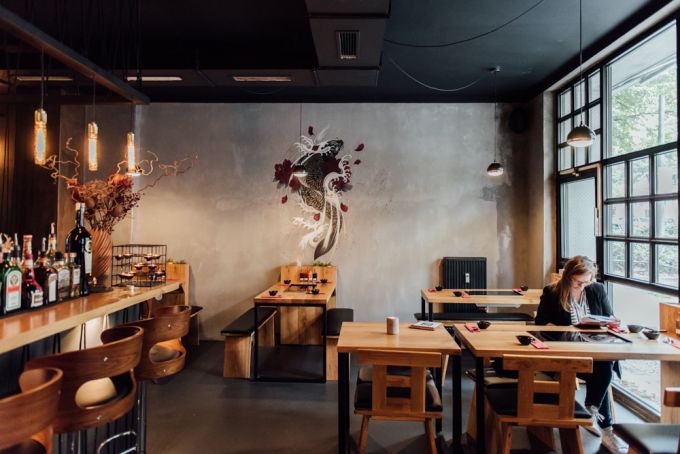 Die Einrichtung ist schlicht und modern, ein japanischer Koi ist das Einzige, was die raue Betonwand ziert. Warmes Holz, die indirekte Beleuchtung und der große Tresen vermitteln aber die notwendige Gemütlichkeit, um hier länger zu verweilen.