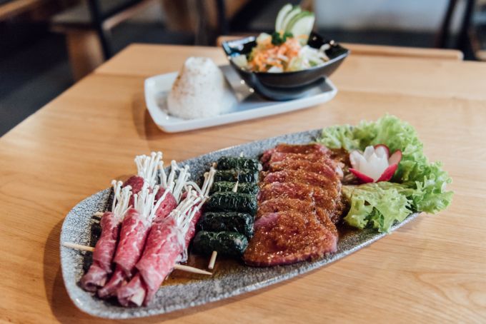 Schon leicht gesättigt von den Vorspeisen freuen wir uns jetzt auf das eigentliche Highlight. Das Ceranfeld in der Mitte des Tisches wird gegen eine Steinplatte mit einer Glasfasergrillmatte getauscht und der Grill aufgeheizt. Dank der Matte kann das Fleisch nicht anbrennen, es kommt also jeder Grillneuling auf seinen Genuss. Unsere Beef-Platte wird serviert: Enoki-Pilze in zartem Rindfeisch umwickelt, Rindfeisch in Wildbetelblätterwraps und argentinisches Entrecôte. Uns läuft das Wasser im Munde zusammen. Dazu gibt's Salat und Reis und je nach Geschmack die frischen Saucen.