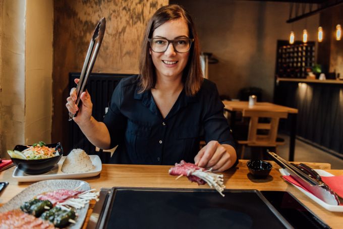 Das Grillen ist wirklich ein Kinderspiel und auch der Rauch hält sich in Grenzen. „Wenn das Lokal voll ist und alle gleichzeitig grillen, kann's schon mal vorkommen, dass es hier ein wenig nebelt. Aber am Tisch erfreut man sich ja dem guten Fleischduft und für die Jacken haben wir Kleiderhüllen als Rauchschutz.“ Das Fleisch ist schön zart und nur dezent gewürzt, jeder Biss ist ein Geschmackserlebnis. Europäische Gerichte mit einer interessanten japanasichen Note zu verfeinern ist in der Tat eine sehr geglückte Fusion. Die einzigen Verlierer sind hier die Vegetarierer, denn bis auf ein paar Starters und Grillgemüse gibt es hier nichts Fleischloses.