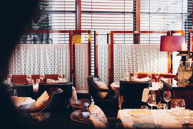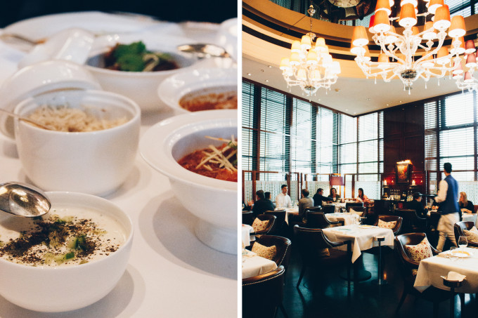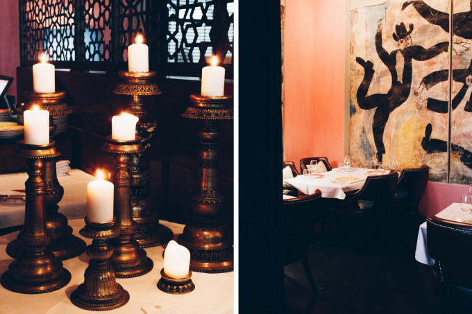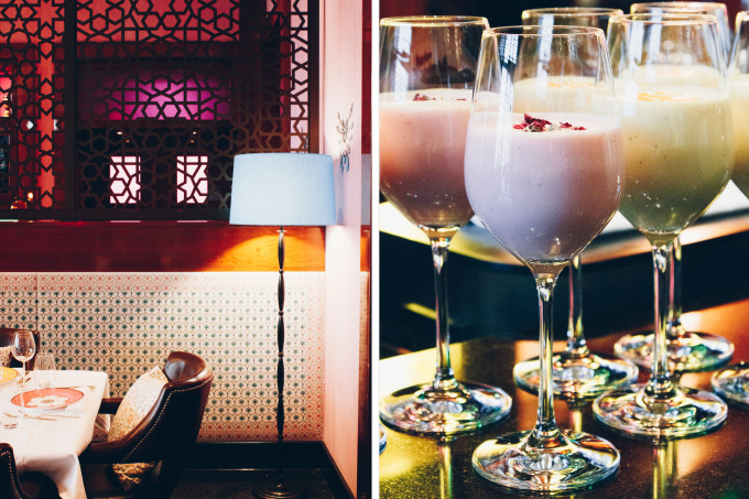 Während sich Berlin in seinen alljährlichen grauen Mantel hüllt, ist es im India Club umso bunter und gemütlicher. Rosa und lila gestrichene Wände, funkelnde Kronleuchter mit Lampenschirmen in Türkis, Grün, Pink oder Gelb, dunkle Holzvertäfelungen aus Mahagoni, blumige Kissenbezüge und dunkelbraune Ledersessel sorgen für ein warmes Ambiente. Wer befürchtet, das Restaurant sei aufgrund seiner Lage spießig und steif, der irrt. Das Personal empfängt mich mit einem Lächeln, ist mehr als aufmerksam und erlaubt sich zwischendurch immer mal den ein oder anderen Witz, das lockert auf. Ankommen, entspannen und genießen.