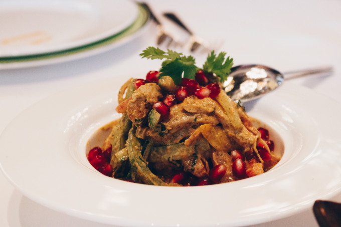 Zur Vorspeise gibt es den Chicken Salat. Das Fleisch ist für mehrere Stunden in einer Joghurtmarinade mit Minze und Paprika eingelegt. Dazu kommen Gurke und Granatapfel, warm, würzig, fruchtig und frisch. Auch die vegetarische Vorspeise mit Aubergine, Zwiebel und Tomate, gebraten in Ghee, überzeugt mit feinen Aromen. Das Naan Brot ist noch heiß und schmeckt verdammt gut. Bloß nicht wieder an Brot satt essen, sag ich mir immer wieder und schiebe den Teller nach dem dritten Stück ganz weit weg.