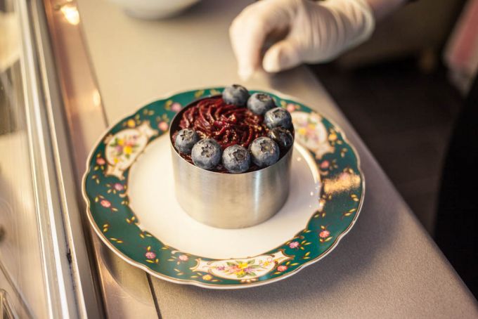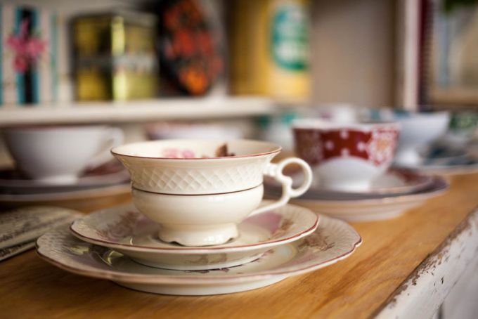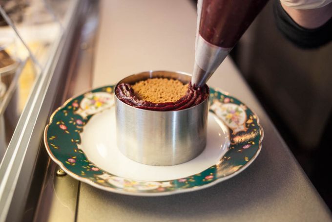 Die Möbel und das Porzellan sind von Ponyhütchen. Lili, die Inhaberin des Vintage-Möbelstores, ist eine alte Freundin von Paul. Wer sich also nicht nur in das leckere Törtchen, sondern auch in den bemalten Porzellanteller oder den alten Holztisch verliebt hat – jeder Tisch ist über 100 Jahre alt – kann beides ganz einfach kaufen und mitnehmen. Was in Sachen Einrichtung nicht von Ponyhütchen ist, ist Marke Eigenbau. Die Bänke mit der goldenen Reling am Fenster und die Halterung für die Cremespritzer hat der Papa von Anne selbst gebaut. Der Hang zur Handwerkskunst liegt in der Familie, bei dem einen mit Holz und Metall, bei der anderen mit Tortenteig.