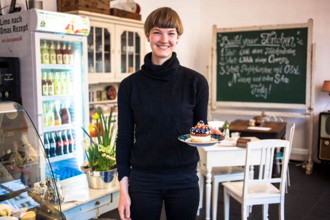 Der Slogan "Build your Törtchen" steht auf der alten Schultafel hinten im Raum und genau das mache ich jetzt auch. In der Vitrine liegen verschiedene Kuchenböden, einige sind vegan und das Banana Bread auch glutenfrei. "Jeder Gast, egal mit welcher Intoleranz oder Vorliebe, soll bei mir etwas zu essen bekommen", erzählt Anne und zeigt auf die Cremes. "Ich verzichte auf Gelantine, hänge die Cremes nur ab und verrühre Agar-Agar. Ein Großteil der Cremes ist laktosefrei, hausgemacht und frisch sind sie alle."