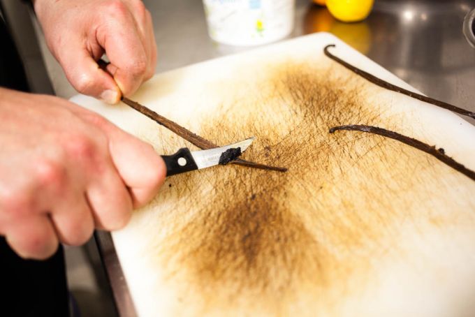Reimar Philipps, der vor knapp zehn Jahren mit dem Eismachen angefangen hat und ursprünglich aus der Musikbranche kommt, legt bei seinen Eissorten auf höchste Qualität und leckersten Geschmack. Um die besten Zutaten zu bekommen, probiert er sich gerne mal durch alle Kürbiskernölfläschen im Supermarkt, reist für Tonkabohnen durch die Welt und suchte in Brandenburg den geeignetsten Hof mit der besten Biomilch. Gefunden hat er die übrigens bei der Lobetaler Bio-Molkerei. Die Zutaten werden dann in der Küche mit großer Sorgfalt und viel Liebe verarbeitet. Die Vanilleschoten werden per Hand ausgekratzt, der Zucker in der Pfanne geschmolzen und karamellisiert und die Walnüsse Stück für Stück dazugegeben. Auf dem Tisch liegt ein dicker Walnuss-Karamellbrocken – ich würde den am liebsten unauffällig in die Tasche stecken und mir alle paar Minuten ein Stückchen abbrechen.