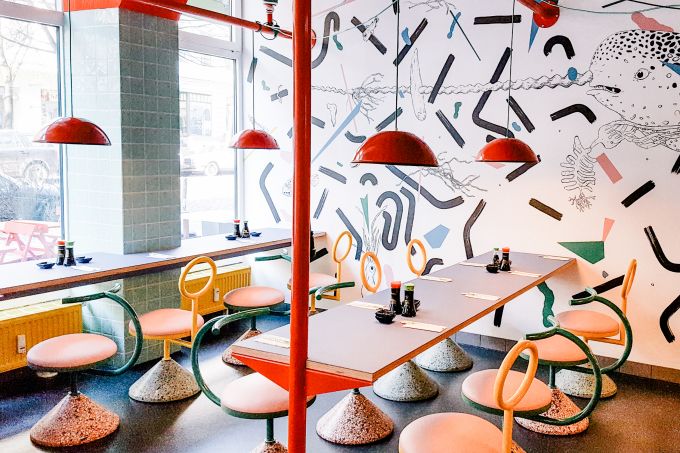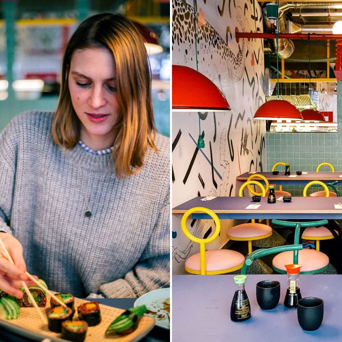 Wenn ihr es in Berlins Restaurants in letzter Zeit vor lauter Gähnen über die immer gleich dreinschauende Einrichtung – viel Holz, viel Glühbirne, viel Kupfer – kaum noch zum Essen schafft, dürftet ihr euch im Sushi-Restaurant Nihombashi allein schon wegen des Aussehens sehr wohl fühlen. Betritt man den kleinen Laden unweit des Rosenthaler Platzes, erwartet einen ein ungewohnter Anblick: Hier ist es bunt und verspielt. "Erfrischend", möchte man sagen. Stilistisch irgendwo zwischen Turnhalle, Schwimmbad und Manga einzuordnen, knallen Farben von den Wänden, Lampen und Stühlen – und das sehr gekonnt.