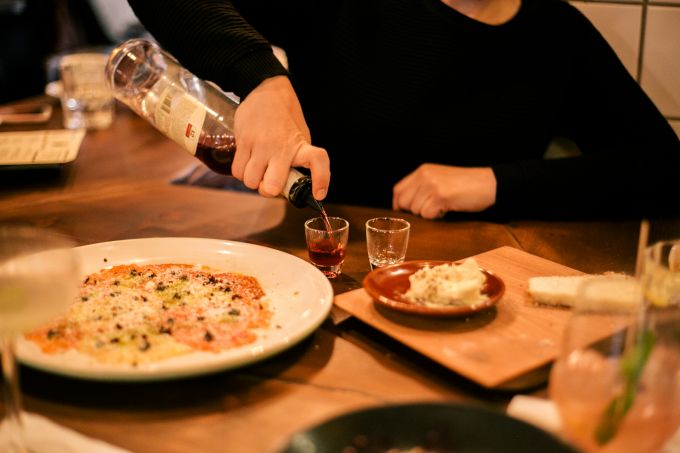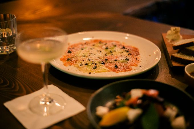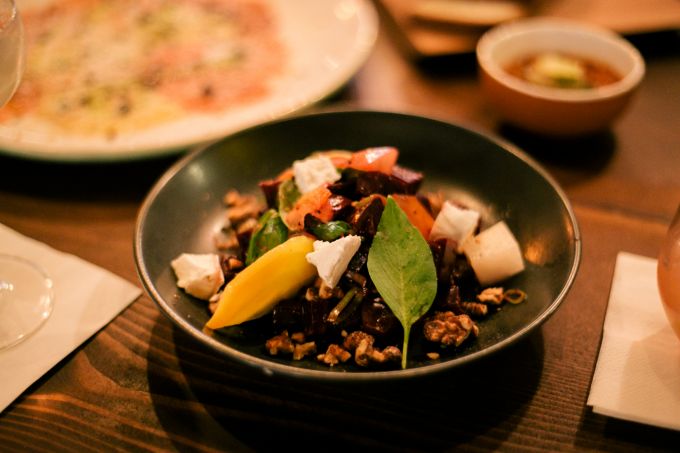 Wer hierher kommt, sollte am besten seine Freunde mitbringen, denn das Motto lautet “Sharing is caring”. Auf der Karte stehen zwar einzelne Gerichte, eigentlich wollen sie aber alle zusammen bestellt werden. Beim “Dinner with Friends”-Menü stellt der Küchenchef genau das für eine Gruppe zusammen, was ihnen gut gefällt. Die geschmackliche Reise führt den Gast entlang eines Tomaten-Carpaccio mit feinen Tulum-Käseraspeln, über Octupus à la Plancha mit Erbsenpüree bis hin zu Rote-Bete-Salat mit kandierten Walnüssen. Dazu stehen Brioche-ähnliches Challah Brot und Tahinibutter auf dem Tisch. Wer mag, kann auch direkt mit einem ordentlichen Rough Margarita (Tequila, Chili, Zitrone) oder einem Negron (hier mit Mezcal statt Gin) in den Abend starten. Aber auch sonst sitzt man nicht auf dem Trockenen. Die Bedienung trinkt zwischendurch einen selbstgemachten Cranberry-Ouzo mit den Gästen an der Bar. Man ist hier ja zum Spaß haben.