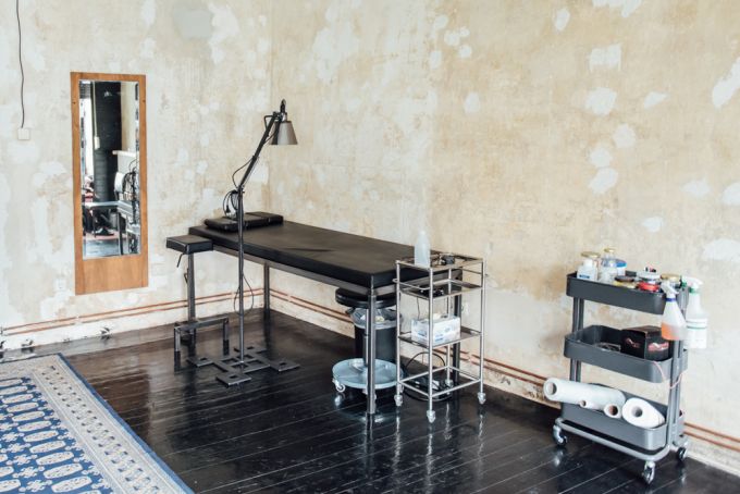Der gebürtige Kanadier wohnt seit vier Jahren in Berlin und eröffnete dieses Jahr sein neues Tattoo-Studio in Neukölln. Das Studio ist von außen fast nicht zu erkennen, ein UNIV ERSE Sticker klebt an der Tür, der Name des Fashionlabels von Brody und seinem Partner Andrew J Buford. Das Studio ist groß, aber spärlich eingerichtet. Die Tapeten wurden von den Wänden rustikal entfernt und es gibt eine Menge Pflanzen – so wie es in Berliner Szeneläden heutzutage eben aussieht. Reduziert auf das Wichtigste: eine gemütliche Couch, ein Schreibtisch für Entwürfe und die Tattoo-Bank. Man fühlt sich wohl, es herrscht eine besondere Energie in diesem Raum. Als Gast bekommt man Gästeschlappen und einen Tee.