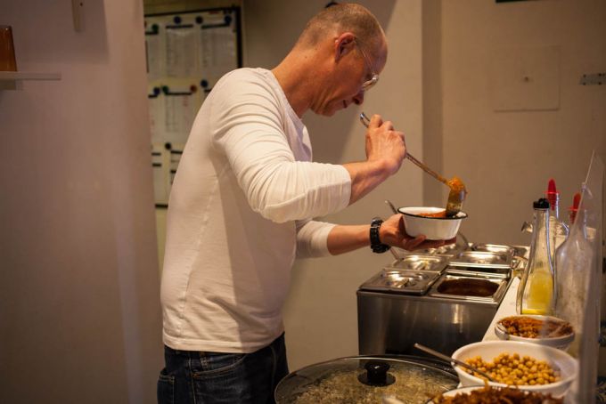 Ich probiere auch das Kafteiji, Michaels Empfehlung. Um die besten Zutaten und das perfekte Rezept zu finden, waren er und sein Team mehrere Wochen in Tunesien und haben sich durch die Straßen und Souks gegessen. Da ich bei Schärfe etwas empfindlich bin, sitze ich nach ein paar Bissen mit Schluckauf am Tisch. Die Gabel wegzulegen kommt aber nicht in Frage, dafür schmecken mir die Kartoffelchips und das frittierte Gemüse zu gut.