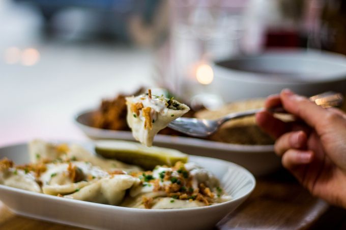 Unbedingt probieren: Piroggen! Am liebsten mochten wir die mit Sauerkraut und Pilzen. Der vegane Bigos mit Räuchertofu und Pflaume ist auch super.