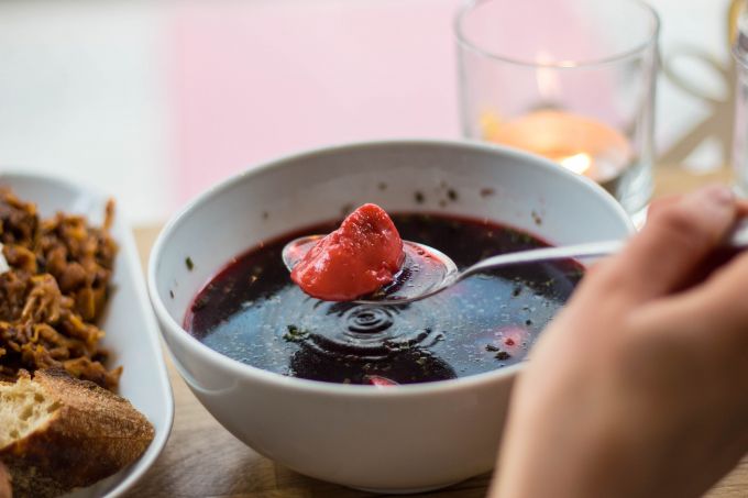 Weil es so viel Neues gibt, serviert uns Karol einfach eine bunte vegan-vegetarische Auswahl: wir bekommen Rote-Bete-Suppe mit Usz(ka), das sind Mini-Piroggen, dazu veganen Bigos mit Räuchertofu und Pflaumen und Baguette und dreierlei Pieroggen: mit Spinat-Buchweizen-Füllung, Sauerkraut-Waldpilze und Ruskie Pierogie mit Kartoffeln und polnischem Käse. Obendrauf gibt's Sojajoghurt und knusprige Röstzwiebeln.