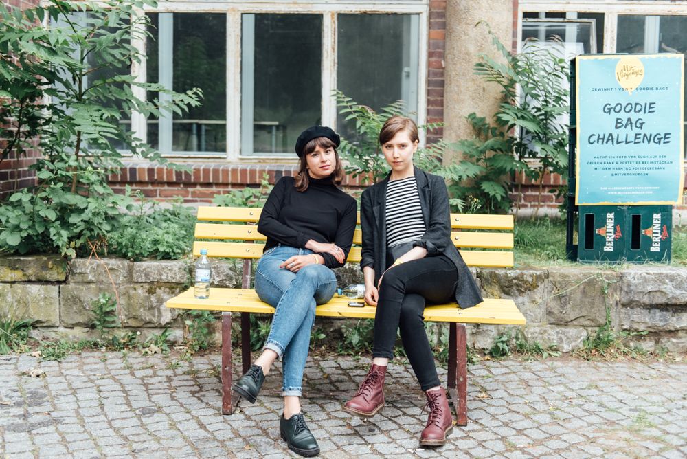 Charlott und Ilona wärmen schon mal die gelbe Bank für die Gäste vor.