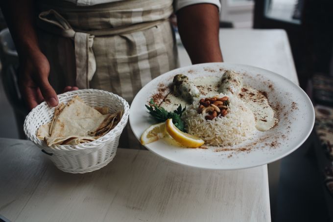 Die Portionen sind so großzügig, dass wir es kaum schaffen, alles aufzuessen. Trotzdem konnten wir es uns nicht nehmen lassen, auch noch den Nachtisch zu probieren. Normalerweise sind mir persönlich arabische Nachspeisen nur eines, nämlich zu süß. Aber hier ist es anders, denn der mit Rosenwasser hergestellte Milchreis mit Zimt ist wirklich lecker und hat durch das Rosenwasser eine ganz eigene Note. Genauso ist es mit dem Madlu'a, einer Art Grießkuchen mit Pistazien und Rosenwasser.