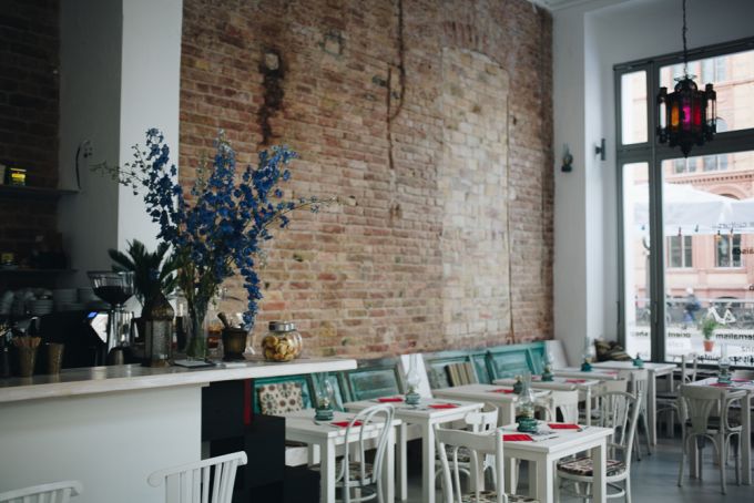 Gelegen im ehemaligen jüdischen Viertel, mit direktem Blick auf die wunderschöne Neue Synagoge, gehört das Haus, in dem sich früher eine Apotheke befand, einer jüdischen Gemeinde aus den USA. Doch statt den Zuschlag für die Ladenfläche einem der großen Mitbewerber, wie etwa McDonalds oder Starbucks zu geben, sind die Glücklichen Frank Alva Buecheler und Bashar Hassoun, die aus diesem 400qm großen und lichtdurchfluteten Laden ein syrisches Restaurant samt Galerie und Studio machten.
