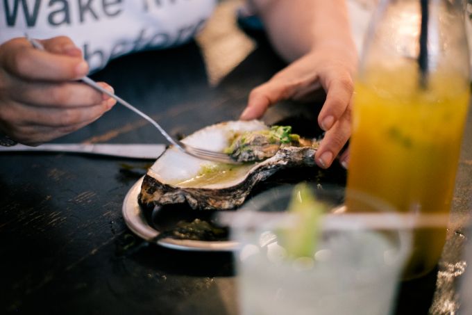 Den "Sesam öffne Dich"-Schlüssel für dieses wilde Food-Abenteuer ist ein Betel-Blatt-Wrap mit Pomelo, Granatapfel, gerösteter Kokosnuss, Erdnuss, Limette, Chili und Tamarind. Was einem da so unschuldig in einem grünen kleinen Paket serviert wird, sorgt für eine Geschmacksexplosion, nach der nichts mehr ist wie zuvor. Weiter geht's dann mit leicht gegrillten, wilden Austern, die mit nam jim, einer typisch thailändischen Chilisoße, serviert werden und ein schönes Raucharoma haben. Das natürliche Salz der Austern ergänzt den Geschmack perfekt. Wer also bei BBQ bisher immer nur an gegrilltes Fleisch gedacht hat, wird bei David und Daniel, die das Feuer fest im Griff haben, eines besseren belehrt oder wie Daniel feststellt: "It has to be about fire AND flavour, that’s the thing most of the people don’t get!"