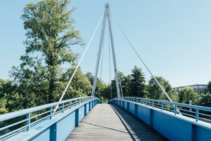 Meine Neugier zieht mich weiter zum Katzengrabensteg. Aber nicht nur wegen des Namens und meiner Lieblingsfarbe Blau, sondern weil die Brücke über die Baumgarteninsel führt und mich diese geheimnisvolle Insel, die man zu Fuß nicht erreichen kann, irgendwie nicht loslässt. Ich laufe über die Holzbretter der Brücke und schaue runter auf die Insel und erwische mich dabei, wie ich in Gedanken schon Pläne fürs Abseilen mache. Ein Häuschen auf dieser Insel wär' wirklich ein Traum, da stimme ich Uwe zu hundert Prozent zu.