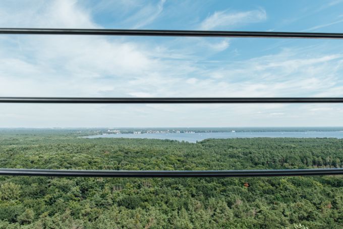 Vom Fischerkietz aus laufe ich zur Bushaltestelle des Busses X69, der direkt zum Müggelturm fährt. Am Turm angekommen, sind die zwei Stunden flanieren schon vorbei, aber wer einmal dort angekommen ist, will natürlich auch hoch und eine Zeit lang bleiben. Und das mache ich auch. Ich bestreite die 126 Stufen nach oben und genieße die Freiheit und den Weitblick.