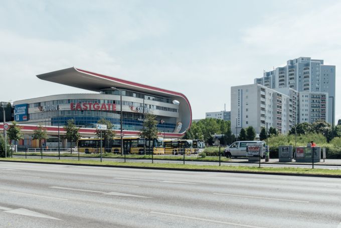 Ein paar Meter von der Haltestelle entfernt begrüßt mich Marzahn mit einer 8 spurigen Straße, mit dem futuristischen Einkaufscenter Eastgate und mehreren Plattenbauten. Was für eine Begrüßung...