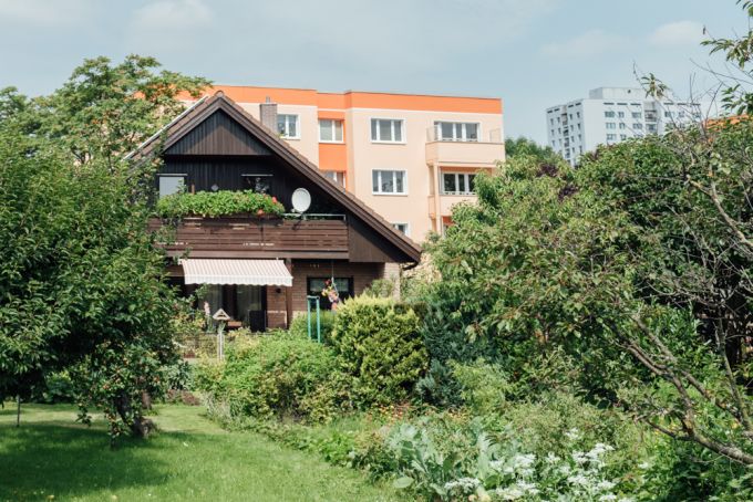 Zwei Straßen muss ich überqueren, die Marzahner Promenade und die Landsberger Allee, um in Marzahns Siedlungsgebiet einzutauchen. Am Kiebitzgrund treffe ich auf Olaf, der gebürtiger Biesdorfer ist und gerade am Zeitungslesen in seinem großen Garten ist.