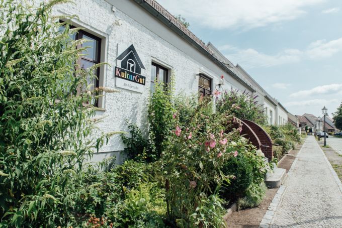 Ein paar Meter weiter erwartet mich Alt-Marzahn. Das kleine "Schaudorf" von Marzahn. Ich fühle mich wie in einem großen Freiluftmuseum und halte Ausschau nach der Eintrittskasse. Viel Kunst und Kultur gibt es hier, Schnittlauch zu kaufen und Bücher zur freien Entnahme. Jedes Blümchen hat hier seinen festen Platz und wenn die Eiskugel mal runter fällt, kann man sie ohne weiteres wieder aufheben, so sauber sieht der Boden hier aus.
