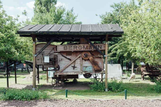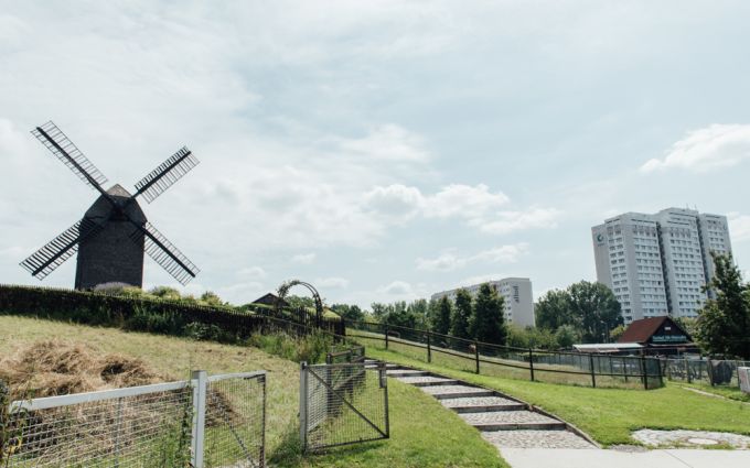 Hinter dem Marzahner Krug befindet sich auf einem kleinen Hügel die Marzahner Bockwindmühle. Sie ist die Rekonstruktion der Mühle vom Jahr 1815. Auf dem Hügel wird gerade frisches Heu geerntet und Schafe, Ponys, Esel und Lamas grasen um die Wette. Bin ich hier wirklich noch in Berlin?