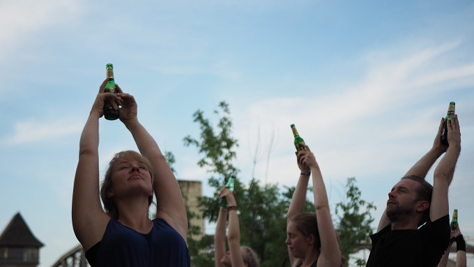 An alle trinkfreudigen Yogis, beim Bier-Yoga wird die Freude des Biertrinkens mit Yoga kombiniert. Ganz ausgelassen können unter freiem Himmel die Bierflaschen sowie Dein Körper geschwenkt werden. Jeden Donnerstag um 19 Uhr bringt Jhula die Bierflaschen im Treptower Park ins Rollen. Eigene Matte nicht vergessen. Na dann Prost.