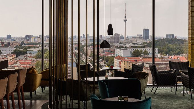 In der 14. Etage des andel's Hotels in Lichtenberg versteckt sich ein kleiner Geheimtipp: die Skybar, deren Interieur sich als "moderner 50er-Jahre-Stil" beschreiben ließe. Von hier habt ihr nicht nur einen tollen Blick über die Stadt und könnt euren Freunden in Prenzlauer Berg zuwinken, auf der Karte finden sich auch allerlei leckere Drinks. Unter dem Motto "Classy Classics meet Berlin Style" mixen euch die Barkeeper Cocktails wie "Der Goldene Westen" oder auch "JWD – Janz Weit Draußen". Passt.
