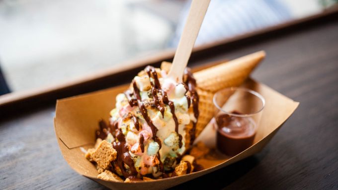 In Prenzlauer Berg hat mit dem Tenzan Lab der erste Kakigōri-Laden Deutschlands eröffnet. Das japanische Eis wird aus extra-langsam gefrorenen Eisblöcken gefräst und mit Matcha-Mascarpone oder Mango-Creme verfeinert. Wer es etwas europäischer mag, kann sich Marshmallows raufstreuen lassen, Traditionalist*innen bevorzugen Shiratama (Mochi-Bälle). Genießen könnt ihr die Geschmacksexplosion im fancy Ambiente des bis ins letzte Detail durchgestylten Ladens, in dem es auch Teezeremonien gibt. Wem Eis zu kalt ist, kann hier auch hausgemachte Waffeln in Fischform naschen, die gibt's mit süßer und herzhafter Füllung.