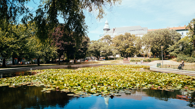 Der Weinbergspark ist an warmen Tagen das Zentrum von Mitte. Hier treffen sich gefühlt alle Bewohner, um im Gras zu liegen und den Tag verstreichen zu lassen. Kinder haben hier sogar zwei Möglichkeiten zu toben: an der Fehrbelliner Straße befindet sich der normale Spielplatz, im Ostteil am Weinbergsweg liegt die Plansche, die im Sommer genauso überrannt ist von Kindern wie der restliche Park. Mehrere Elementen sprühen Wasser, sodass die Kids am Ende einmal komplett nass sind.