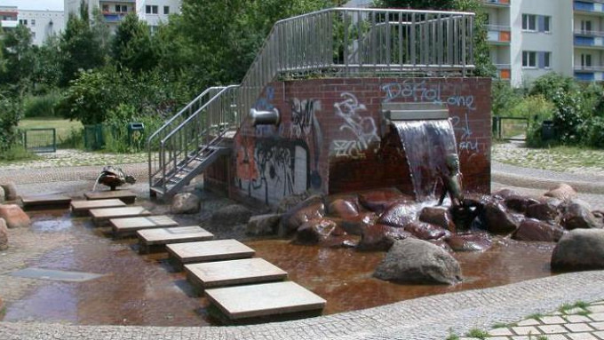 Mitten in einer Marzahner Wohnsiedlung befindet sich ein ausgefallener Wasserspielplatz, auf dem Kinder ein Treppenpodest erklettern können, das Wasser über Findlinge in ein Becken spült. Der Weg zum Podest führt auf großen Platten durch das Wasser hindurch. Rund um das Podest speien Steintiere Wasser. Der perfekte Planschspaß für die Kleinen.