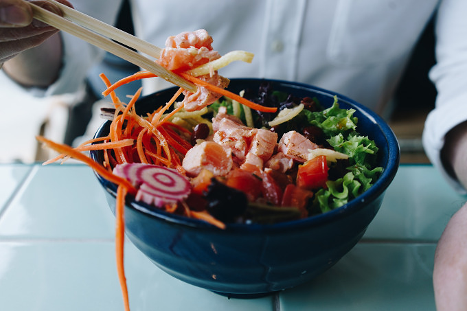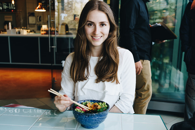 Dieses Mal entscheide ich mich für die Ohana Vegan, eine der insgesamt zwei fischfreien Signature-Bowls der Karte. Auf den (nicht zu klebrigen) Sushireis kommen Wakamesalat, Edamame, Süßkartoffel, Avocado, Gurke, Tofu und eine Soja-Sesam-Soße. Mhm, lecker! Wir nehmen außerdem eine Trüffel-Lachs-Bowl mit flambiertem Lachs, Tomatensalsa, japanischen Strohpommes und einem Parmesam-Trüffel-Dressing. Für eine Poke-Bowl eher ungewöhnlich, aber umso leckerer.