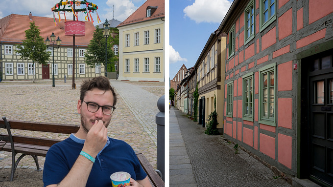 Das kleine Städtchen am Mündesee ist für stressgeplagte Großstädter eine Oase der Erholung. Entlang der Stadtmauer lassen sich die kleinen und oftmals bunt angemalten Fachwerkhäuschen bestaunen. Mit einem Eis in der Hand erreichen wir den Marktplatz, der leergefegt ist. Nanu, wo treiben sich hier die Menschen rum? Als wir die Uferpromenade erreichen, wissen wir es: Die Bewohner halten sich scheinbar am liebsten am See auf, dessen Uferweg über einen Skulpturenpark verfügt. Wir genießen noch etwas die frische Seebrise, eh es weitergeht zur Blumberger Mühle.