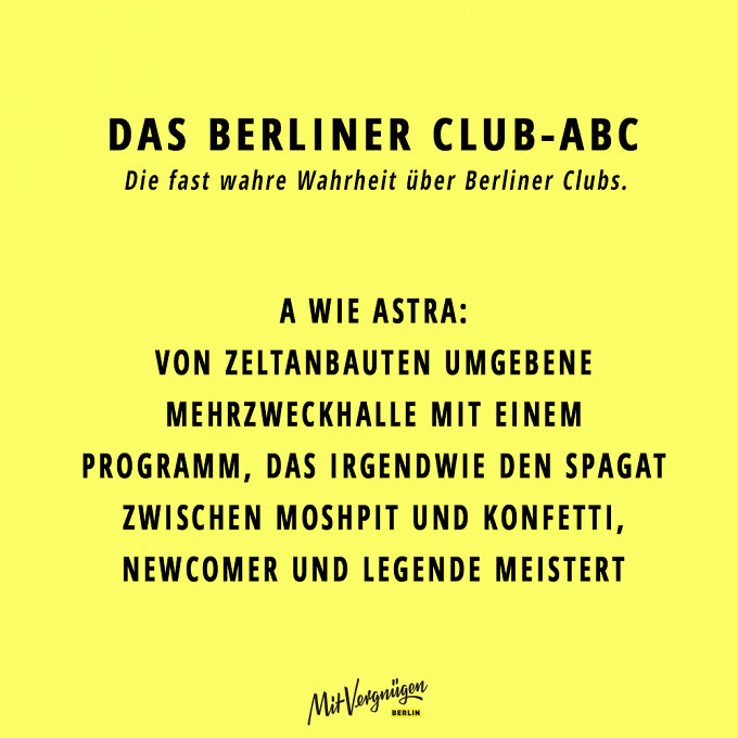 Berlin ist und bleibt die Party-Hauptstadt. Ihr wollt Techno? Gibt's drei Tage im Block an x-Adressen auf die Ohren! Ihr wollt Hip-Hop? Kein Problem, von Oldschool bis Deutschrap ist alles zu haben. Es sollen doch lieber Charthits sein? Auch in diesem Genre finden sich unzählige Optionen. Das führt natürlich zu einem ganz schön großen Dschungel aus großen und kleinen, guten und schlechten, vollen und extrem vollen Clubs, die sich überall im Stadtbild finden lassen. Um den Überblick zu behalten und zugleich die Quintessenz eines jeden guten Tanztempels herauszufiltern, haben wir ein ABC der wichtigsten Clubs erstellt, alle Angaben natürlich wie immer ohne Gewähr, dass ihr auch reinkommt.