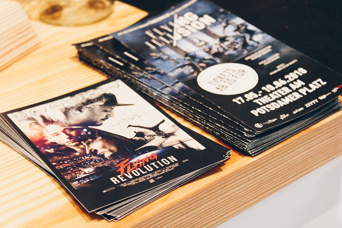 Es ist mein erster Besuch in der Academy in Kreuzberg. In einem Hinterhof in der Nähe vom Moritzplatz versteckt sich hier eine riesige Tanzschule mit mehreren Trainingsräumen, einem Gym und einem eigenem Café. Die Kaffeeenthusiasten vom Café Kraft haben sich hier mit dem Zweitausend vergrößert und servieren leckersten Flat White, Zitronenkuchen und Quinoasalat. Die Academy feiert dieses Jahr übrigens ihr zehnjähriges Jubiläum. Gemeinsam mit der Rückkehr der Flying Illusion Show in die Heimatstadt ein guter Grund zum Feiern.