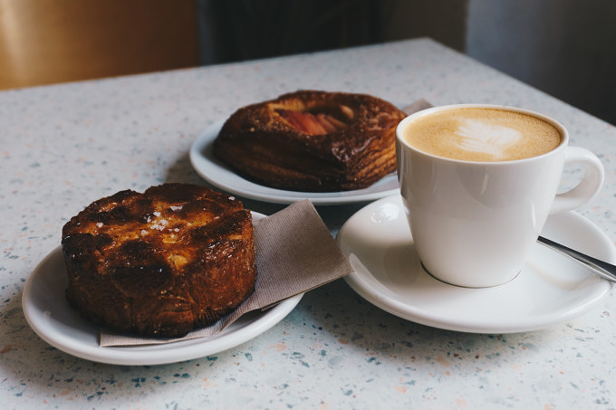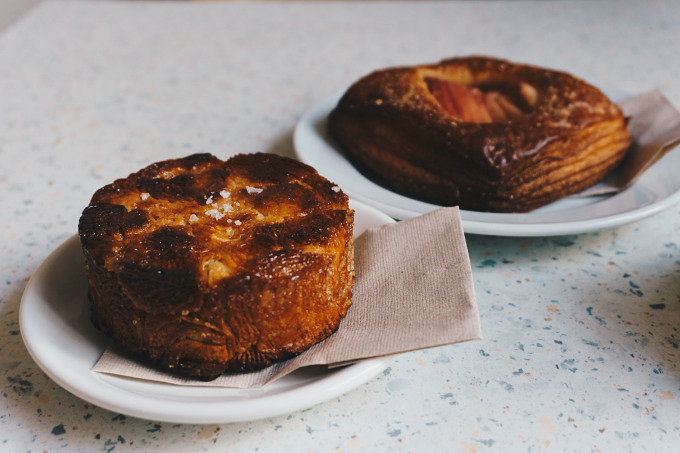 Ganz traditionell wird im Albatross direkt aus der Backstube verkauft, diese ist nur durch einen Vorhang vom Cafébereich getrennt. Es duftet herrlich nach ofenfrischen Brötchen, Zimt und Kaffee. Die Wände sind nackt und teils unverputzt. Wenn es ein stilistisches Highlight gibt, dann sind es die Terrazzo-Tischplatten. Ein echter Hingucker ist die Theke, auf die man geradewegs zuläuft, wenn man das Café am ruhigeren Ende der Graefestraße betritt. Hier reihen sich Schoko- und Buttercroissants an süße und herzhafte Plunderstückchen, die je nach Saison unterschiedlich gefüllt und belegt sind, Kardamom- und Zimtschleifen. Mittendrin liegt dann auch noch die Queen. Die bretonische Spezialität heißt eigentlich Kouign Amann. Was sich hinter dem Namen versteckt? Unzählige Schichten Blätterteig, Butter, karamellisierter Zucker und etwas Salz. Kurz gesagt: Unverschämt lecker!