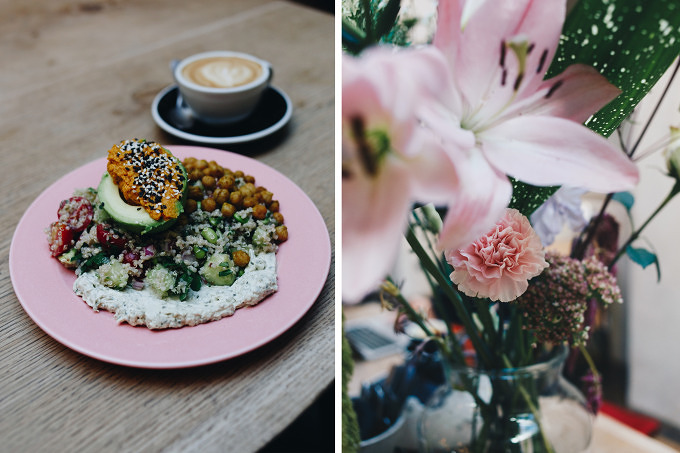 Ich entscheide mich für einen Cappuccino und den "Brunch Plate" mit Quinoa-Tabouleh, Kräutern, Edamame, gewürzten Kichererbsen, gerösteten Körnern, grünem Tahini und einer halben Avocado. Ein bunter Mix an Salaten und Zutaten auf einem ebenso bunten Teller. Wer meint, ein vegan glutenfreies Frühstück sei langweilig, den belehre ich hiermit eines besseren. Der Kaffee schmeckt hier übrigens auch fantastisch. In der Umgebung findet man keinen leckereren. Nach dem Frühstück fühle ich mich gestärkt und ready für den Tag, Platz für ein Stück Banana Bread ist aber trotzdem noch da.