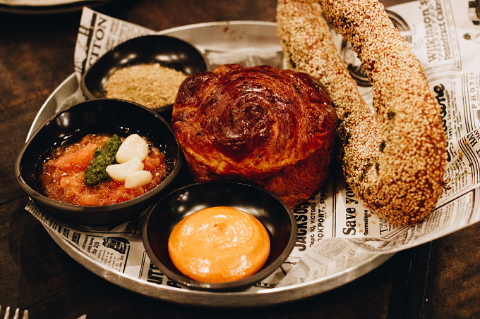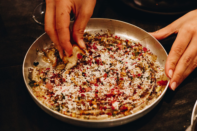 Wir starten mit den Forellen-Donuts (die sind unter anderem mit Zimt gewürzt und verdammt lecker), dem Brotkorb und dem geräucherten Auberginen-Carpaccio. Das Kubbana, ein jemenitisches Brioche, und der Jerusalem-Bagel sind hausgemacht und für das fluffig-buttrige Brioche breche ich sogar mein Weizen-Fasten. Ich reiße ein Stück ab und tunke es in das Auberginen-Carpaccio. Meir findet diese Art des Essens super. "So wird das gegessen, mit den Händen, genau so", ermutigt er mich. Für mich gehört die Aubergine mindestens genau so zur israelischen Küche wie Hummus und im Layla wird sie ganz anders serviert als sonst üblich. Zu dem geräucherten Auberginenmousse gesellen sich Tahini, Dattelhonig, Pistazien, Feta-Schnee und Rosenblüten – ein Fest der Geschmäcker und Aromen.