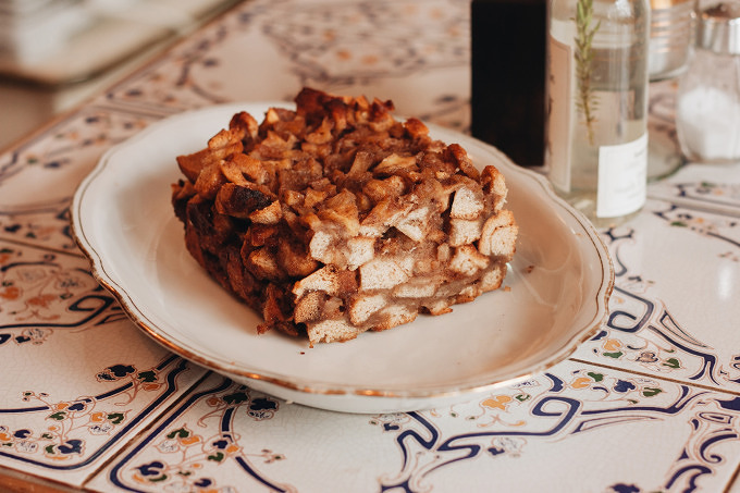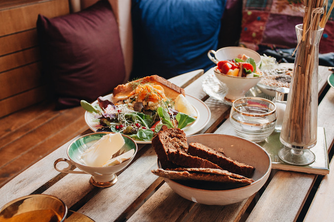 „Das vegane Frühstücksangebot ist unsere Spezialität. Als ich noch in England war, habe ich es jede Woche für meine Freunde gekocht und die Rezepte mit nach Berlin genommen“, sagt Oliver. Es gibt Tofu-Rührei, Knoblauch-Spinat angerichtet mit geräucherten Dill-Lachs aus Karotten auf selbstgebackenem Schwarzbrot oder hausgemachte Zwiebel- und Salbeiwurst, Rosmarin-Bohnen und Pilze. Wer es lieber süß mag, ist mit den Porridge-Varianten (Hafer oder Roggenflocken mit verschiedenen Toppings) gut bedient.