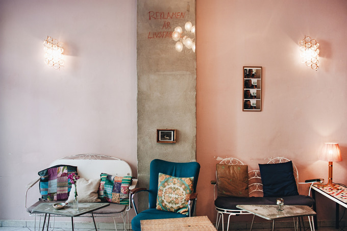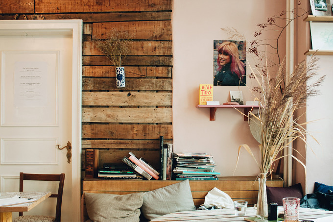 Auch das Interieur verspricht, was man von Skandinaviern gewohnt ist: Guten Geschmack. Der schmale Raum begrüßt mit Retro-Sessels, schnörkelige Metallstühlen und selbstgemachten Wandlampen. Dünne Metallstäbe halten Tonscheiben, die als kleine Tische dienen und die Vitrine mit selbstgebackener Blaubeer-Tarte macht Lust auf mehr. Auf der eingebauten Eckbank stapeln sich feministische Magazine und Kunstbücher. „Wir sind ein queeres Café“, sagt Inhaber Oliver Boldwin. „Jeder ist willkommen!“