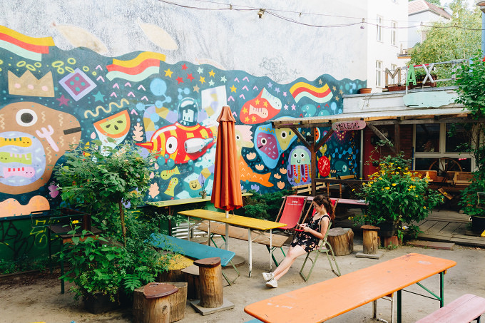 Eistechnisch gestärkt, spazieren wir dann vom Süßfein aus in Richtung Veteranenstraße, wo wir zuerst einen kleinen Abstecher ins ACUD machen. Das ACUD ist eines der wenigen noch existierenden freien Kunsthäuser Berlins. Auf knapp 1.500 Quadratmetern tummeln sich unter anderem ein Theater, ein Kino, ein Club, ein Studio und eine Galerie sowie eine Bar, eine Druckerei und auch noch mehrere Ateliers. Vorne wartet ein kleiner Biergarten darauf, dass ihr euch niederlasst und vom Innenhof aus könnt ihr auch ein bisschen in die Ateliers junger Künstler luschern. Regelmäßig finden auch Filmvorführungen, Diskussionsrunden, Clubnights und Flohmärkte statt, den genauen Terminkalender findet ihr hier.