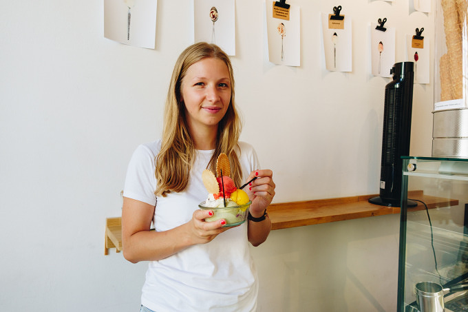 Normalerweise starten wir unsere Kieztouren ja immer mit einem guten Kaffee und einem leckeren Frühstück. So wie man eben gut in den Tag startet. Bei über 30 Grad in Berlin, und vielleicht weil ich eine nicht ganz so natürliche Leidenschaft für Eis habe, skippe ich das Frühstück und beginne direkt im Süßfein. Lisa, die Besitzerin dieser zuckersüßen kleinen Eisdiele auf der Brunnenstraße, begrüßt einen immer mit dem größten Lächeln und der besten Laune der Welt und serviert dazu noch unglaublich gutes Eis in bester (Bio-)Qualität. Die Sorten reichen von Erdbeer-Basilikum und Mango, über Pistazie bis hin zu meinem persönlichen Favoriten Blueberry Cheesecake. Wer zu seinem (großzügigen) Eisbecher doch noch ein Käffchen möchte, bekommt auch das im Süßfein und der macht daraus dann ja doch ein Frühstück, ein Eisfrühstück quasi.