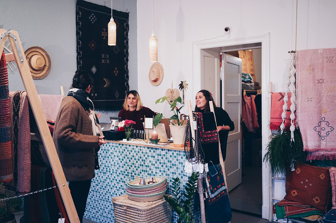 Frisch gestärkt biegen wir von der Stargarder Straße in die Dunckerstraße ein, wo Vanessa (33) und Leonie (30) ihren ersten eigenen Store eröffnet haben. Die beiden sind beste Freundinnen, lieben das Reisen und haben von ihren Reisen einige Kostbarkeiten mitgebracht, die sie anfangs in ihrem eigenen Online-Shop vertrieben. Mittlerweile gibt's die hübschen Wohnaccessoires – die sie teilweise selbst produzieren lassen – auch offline in ihrem schönen Store am Helmholtzplatz. Die beiden arbeiten eng mit NGOs zusammen, besuchen ihre Produzenten regelmäßig und versuchen, sie durch den fairen Verkauf zu unterstützen.