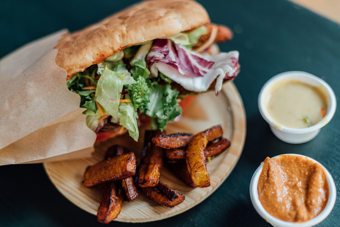 In drei Schritten wählt man aus, was in den Kojo kommen soll. Der erste Schritt ist die Füllung, die gibt es entweder mit Fleisch (Huhn, Lamm, Rind) oder vegetarisch (Kichererbsen oder Bohnen). Dann kommen die selbstgemachten Saucen: Tomaten-Knoblauch-Stew, Erdnusssauce, Aprikose-Senf und Mango-Curry. Die ersten beiden Saucen sind sogar vegan. Danach kann man seinen Kojo mit verschiedenen Extras wie Mais, Avocado, Ziegenkäse, Mangowürfel, Jalapenos upgraden. Dazu gibts allerlei verschiedene Pommes, meine Favoriten sind eindeutig die Kochbananen-Pommes, die hab ich so in dieser Form noch nie gegessen und sie schmecken einfach super lecker.