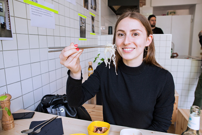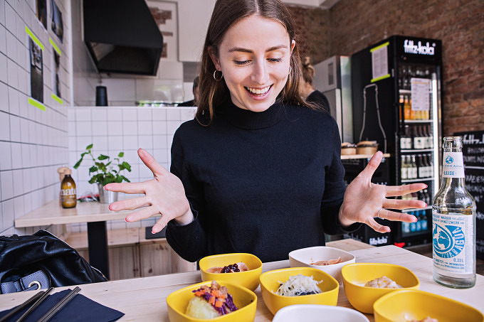 Nach und nach bringt uns Anna im Minutentakt kleine gelbe Bambus-Schälchen mit bunten Dumplings aus der Küche. Den Anfang macht die neuste Kreation: Roastbeef auf Kartoffelspeckcrunch mit Wildkräuterremoulade. Das leckere Dings setzt die Messlatte in Sachen Geschmack ziemlich hoch, aber auch die nachfolgenden Dumplings überzeugen mich und erzeugen kleine große Geschmacksexplosionen. Eine senffarbene Teigtasche mit Currylinsenfüllung auf Crème fraîche, ein schwarzer Dumpling gefüllt mit Nürnberger Bratwurst und Sauerkraut auf Wasabicreme, ein rosafarbenes Dings mit Camembert und Preiselbeeren oder der Sauerbraten im Klossteig auf Bratensoße mit Pickles und Rotkraut, der mich allein vom Geruch an Weihnachten erinnert – wir probieren uns hungrig von einem Dings zum anderen und reisen dabei kulinarisch einmal um die Welt. "Wir versuchen, uns bei den Dings keine Grenzen zu setzen", sagt Anna. "So ist für jeden etwas dabei und wir müssen uns nicht limitieren."