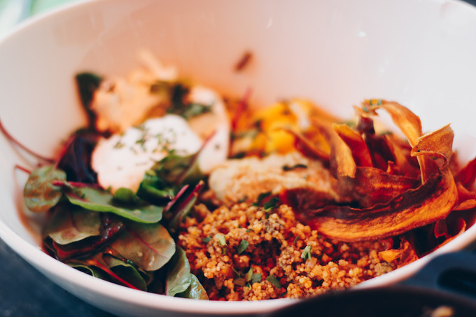 Obwohl uns das Gebäck anlächelt und ich bei den Franzbrötchen kaum widerstehen kann – ich habe eine ausgereifte Zimt-Schwäche –, wollen wir erstmal etwas richtiges frühstücken. Die Wahl fällt auf das "Supergrain Porridge" mit Hafermilch, Chia, Mango, Apfel und Blaubeeren und die "Lovely Bowl", ein Frühstückssalat mit Tabouleh, Süßkartoffelchips, Avocado, Hummus, Mango-Minz-Salat und einem pochiertes Ei. Wer denkt, Porridge ist nur was für kalte Tage ist, der irrt. Der warme Haferbrei ist genau das Richtige, macht mich satt, aber nicht platt und das Obst-Topping sorgt für Frische.