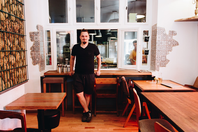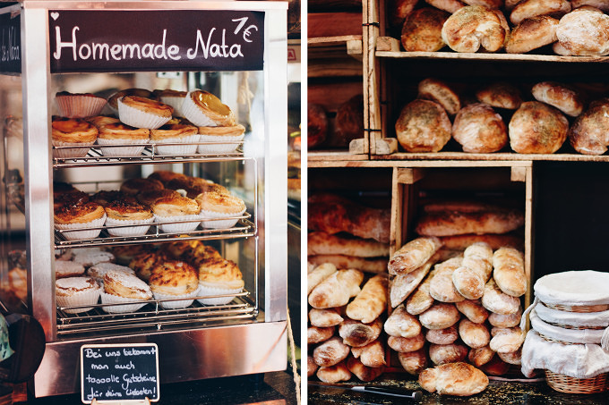 Neben einer moosbewachsenen Wand, einer gläsernen Küche, portugiesischen Fliesen und einer Couch wie bei Oma ist der Tresen in jedem Fall ein echter Hingucker. Überall liegt hausgemachtes Gebäck, hinter der Bar türmen sich Baguettes und Ciabattas, Franzbrötchen, Brioche und Croissants liegen in Körben auf der Theke und belegte Brötchen, Kuchen und Co. in der Vitrine. "Wir sind Café und Bäckerei. Hinten in der Küche backen wir jede Nacht, damit am morgen alles frisch ist.", erzählt Besitzer Oli, der selbst gelernter Koch ist. Weil der Bäcker Portugiese ist gibt's hier auch leckere Natas und andere Leckereien aus Jorges Heimat, wie Corroassa Creme oder Bolo de Arroz.